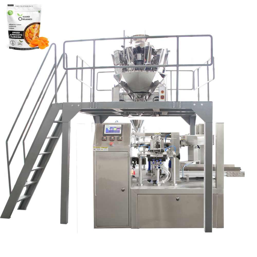 Máy đóng gói túi quay với các liều lượng khác nhau (như máy đo nhiều đầu, chất làm đầy, chất làm đầy chất lỏng, v.v.) có thể phù hợp cho việc đóng gói tự động cho dạng hạt, bột, chất lỏng, bột nhão, vv Các loại sản phẩm khác nhau với túi khóa kéo đứng