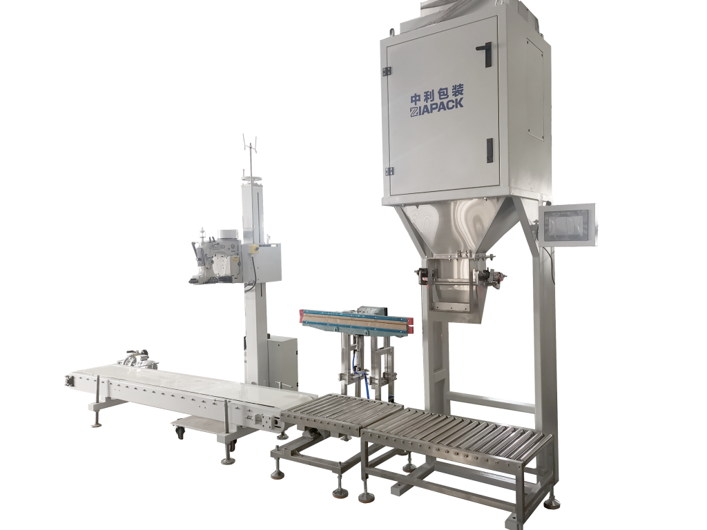 Đặt túi thủ công → Nạp tự động → Cân tự động → Băng tải túi tự động → Tự động khâu / đóng túi tự động bằng tay.