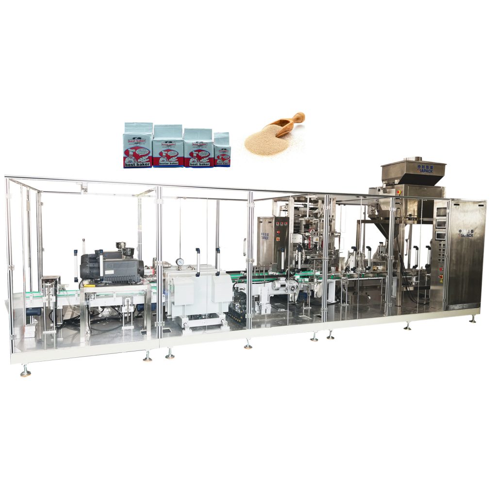 Máy này bao gồm một bộ thang máy chân không ZK3 để nạp men khô, một bộ máy đóng gói và niêm phong túi thẳng đứng ZL520. Một bộ máy cân bốn thùng ZLC4-2000, Một bộ máy đóng gói buồng chân không đôi ZL-100V2. Máy này được sử dụng rộng rãi để đóng gói hóa chất dược phẩm thực phẩm và các sản phẩm khác ở dạng bột hoặc hạt nhỏ. Giống như bột cà phê, bột men, bột mì, v.v. Toàn bộ máy sử dụng bơm bên trong để hút chân không sản phẩm. Mức độ chân không rất cao và tốc độ đóng gói rất cao có thể đạt tới 30 túi / phút. Thành phẩm có thời hạn sử dụng dài và hình thức đẹp.